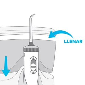 - Llena el depósito del irrigador con agua tibia y colócalo firmemente en la base.